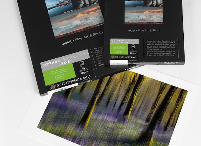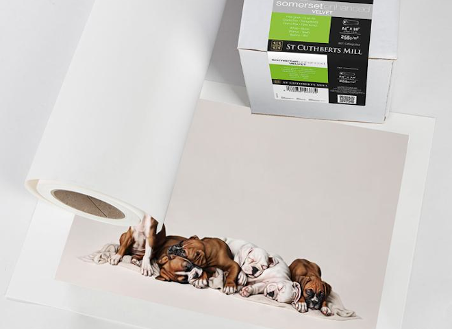 Canson Somerset Enhanced Velvet C762511006 es un papel fine art en rollo de 36" x 20 m y 330 g/m², 100% algodón, con acabado mate aterciopelado, ideal para impresión inkjet profesional con alta calidad de detalle, colores intensos y gran durabilidad.